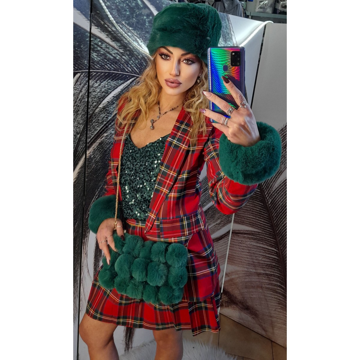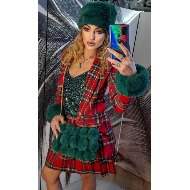Completo scozzese rosso com'osto da minigonna plissé lunghezza sopra al ginocchio e giacca corta elegante. Taglia unica