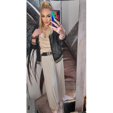 Completo in simil-camoscio composto da gonnellina corta con balza e giubbino con taschine e bottoni argento in tessuto elasticizzato perfetto per l'autunno. Taglia unica