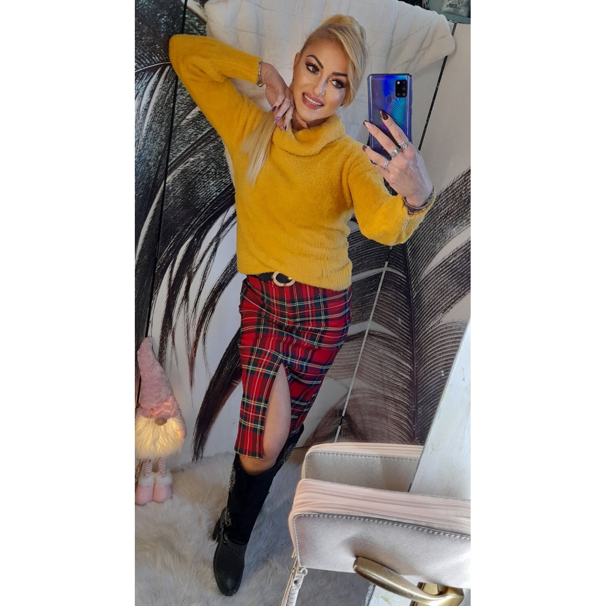 Gonna longuette elasticizzata in tessuto scozzese rosso con ampio spacco sul davanti, vestibilità aderente. Taglia unica