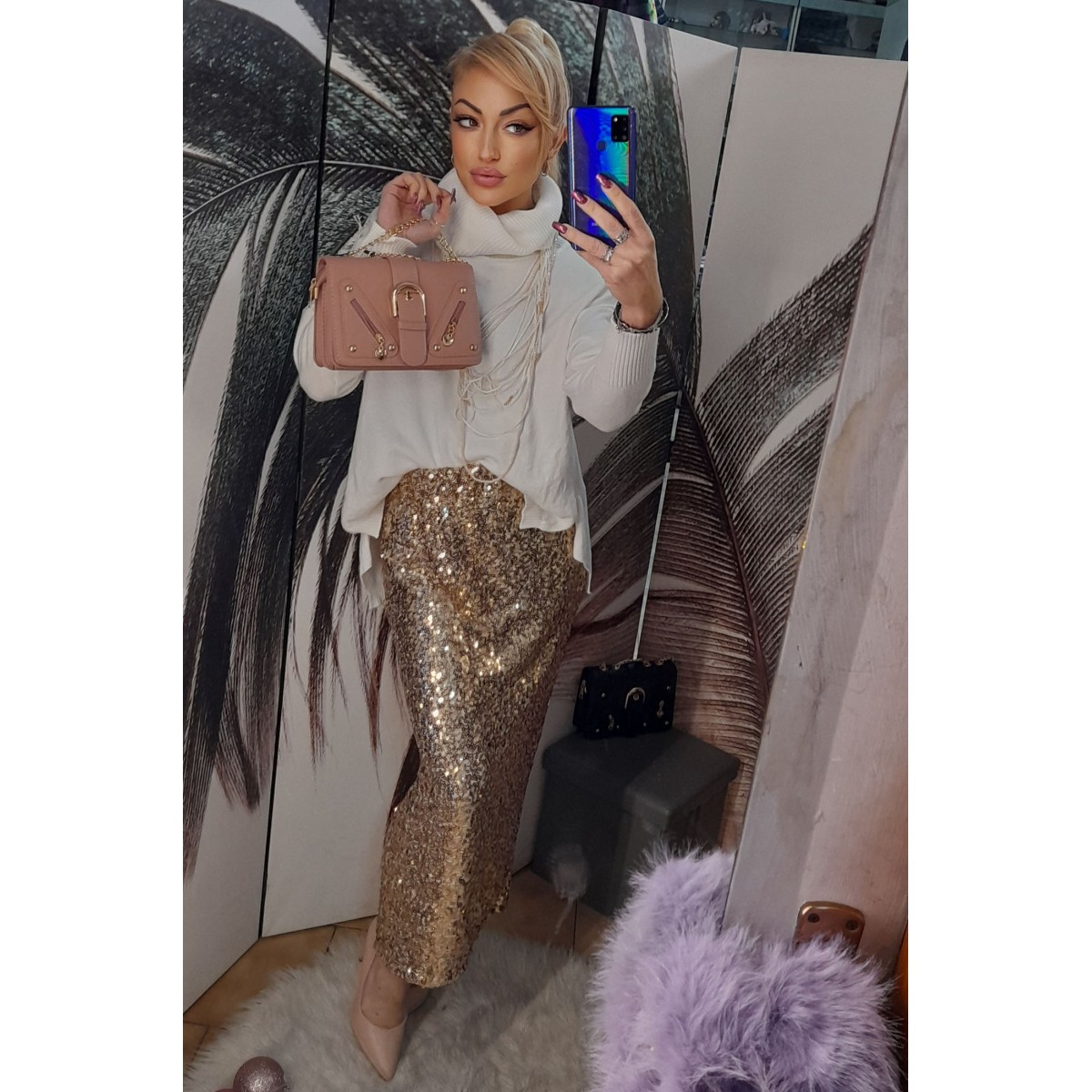 Completo gonna longuette e maglia tono su tono | Nicole Completo chic ed elegante composto da gonna lunga aderente con ampio spacco laterale, blusa elasticizzata con nodo. Vestibilità slim. Taglia unica