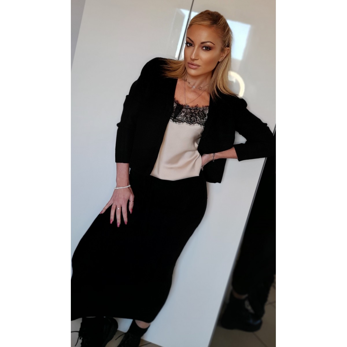 Completo gonna longuette e maglia tono su tono | Nicole Completo chic ed elegante composto da gonna lunga aderente con ampio spacco laterale, blusa elasticizzata con nodo. Vestibilità slim. Taglia unica