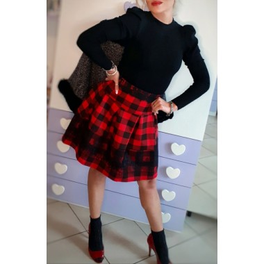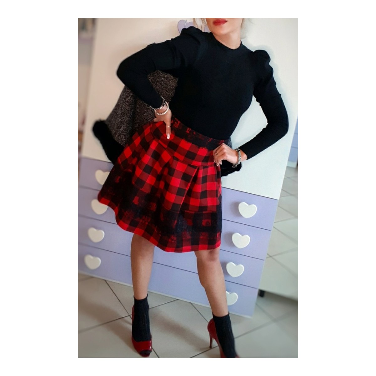 Gonna in fantasia tartan sui toni del rosso e nero, modello svasato con dettagli in pizzo nero, lunghezza al ginocchio. Perfetto per il periodo natalizio da abbinare ad un lupetto rosso oppure nero.