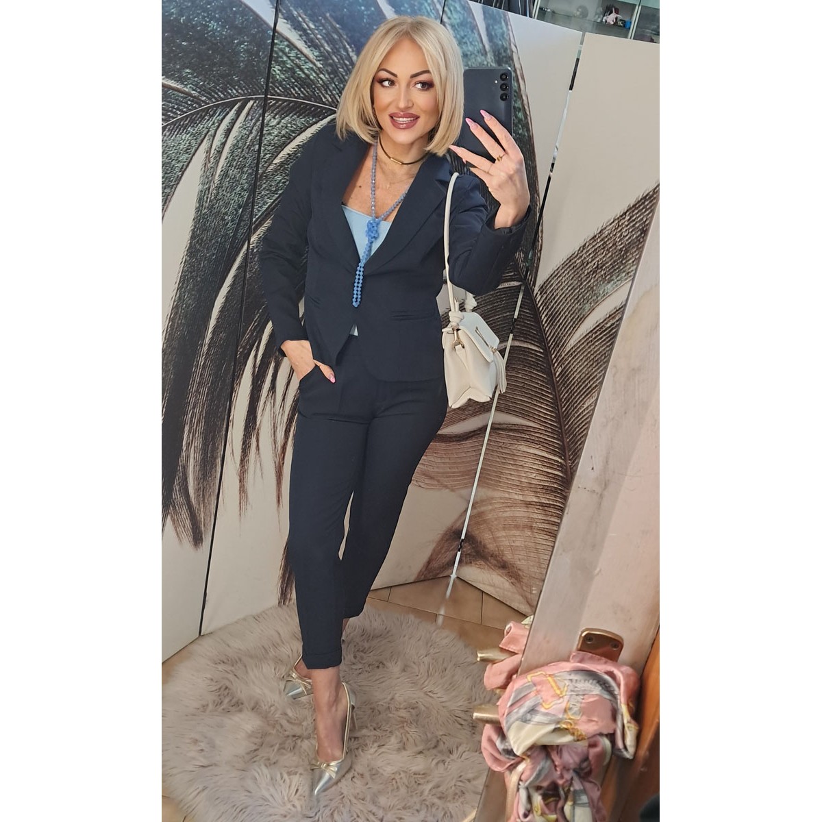 Tailleur elegante in cotone elasticizzato composto da pantalone aderente a sigaretta e giacca foderata. Vestibilità slim.