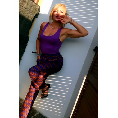 Completo giacca e pantalone a fantasia geometrica | Genny Completo giacca a tre quarti foderata con bottoni e due finte tasche laterali, pantalone a sigaretta con due tasche a fantasia geometrica, modello molto particolare e chic. Taglia unica S/M