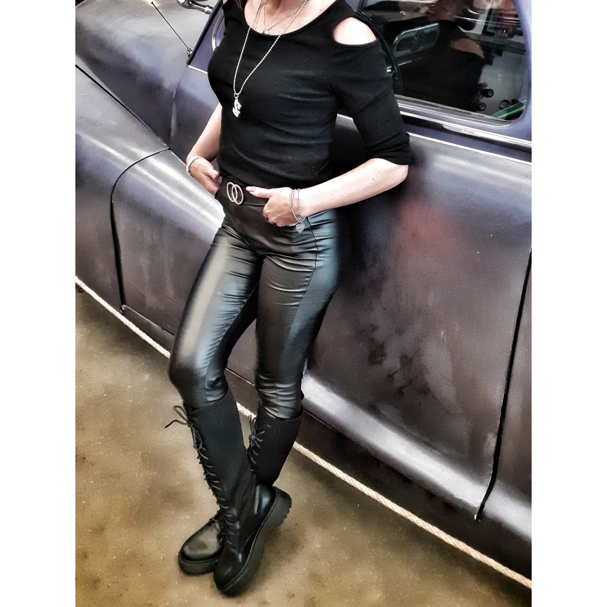 Pantaloni aderenti in similpelle con fibbia dorata doppio cerchio, 2 tasche laterali, vestibilità aderente.