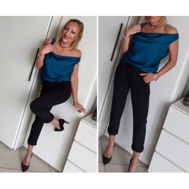Canotta effetto lucido con spalla larga e ampia scollatura a barchetta che mette in evidenza le spalle, vestibilità morbida, taglio sciancrato, tessuto lucido (colore disponibile come da foto).
