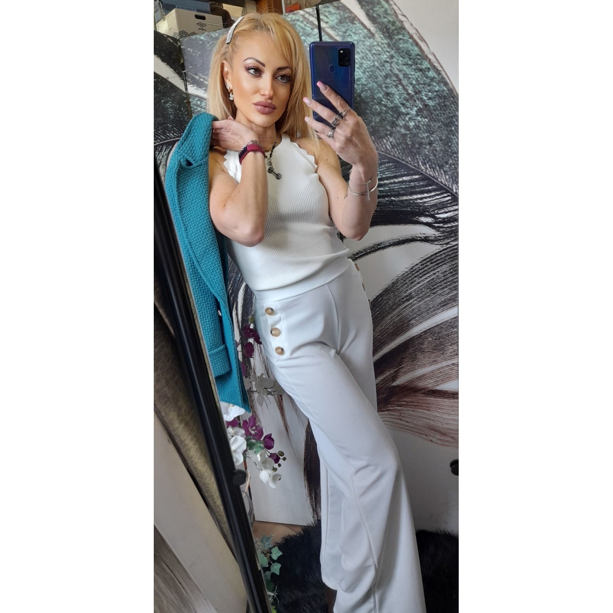 Completo casual formato da: maglioncino corto con profili bianchi e spacchi sui polsi, scollatura tonda vestibilità aderente. Pantalone a zampa, vestibilità slim. Taglia unica