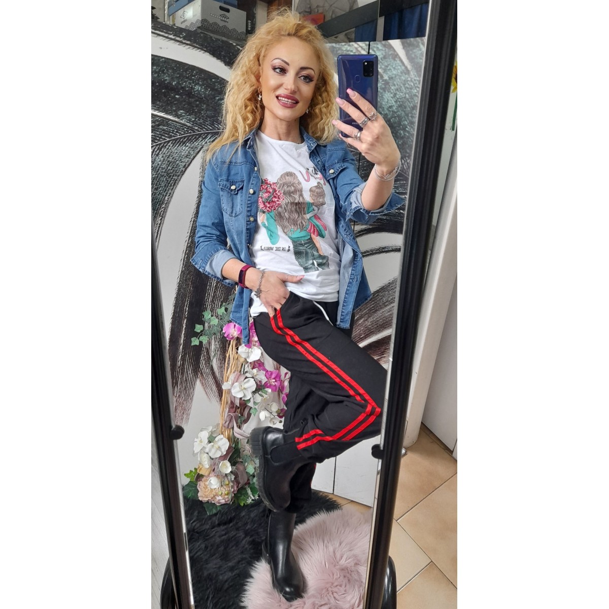 Completo maculato | Denise Completo maculato in viscosa con top corto con elastico, maniche a giro, scollo alla coreana con cerniera, pantalone modello sporty con elastico in vita e alla caviglia. Taglia unica
