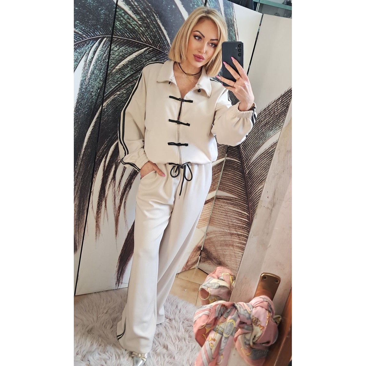 Completo sportivo leggero | Fiona Completo in tessuto leggero composto da pantalone a campana sportivo, casacca con scollo ampio tondo, vestibilità morbida. Taglia unica