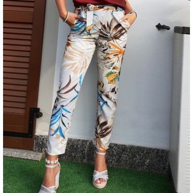 Pantaloni a sigaretta con stampa floreale, elastico in vita arricciato e cintura tono su tono, vestibilità slim, 2 tasche laterali, lunghezza alla caviglia. Modello molto chic ed elegante, perfetto per la stagione primavera-estate. Taglia unica.