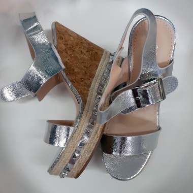 Sandali argento in ecopelle, chiusura con cinturino e fibbia su lato esterno, zeppa alta 10 cm. Sul tacco in sughero e corda sono state applicate delle piccole borchie. Modello molto particolare e ricercato nei dettagli.