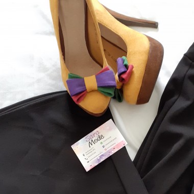 Decolleté scamosciate con tacco 12 con open-toe, interno in ecopelle, punta leggermente arrotondata con fiocchetto di colori diversi che rendono ancora più particolare questo articolo.