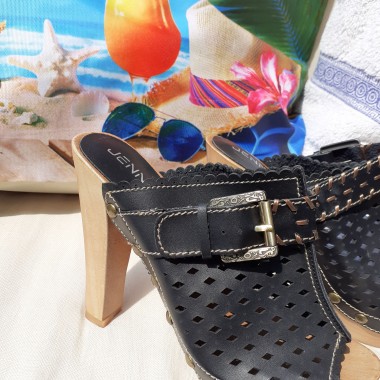 Sabot Moda Mare, punta aperta, tacco largo in legno con plateau anteriore, tacco 11 cm. Parte anteriore in eco-pelle nero traforata con fibbia.