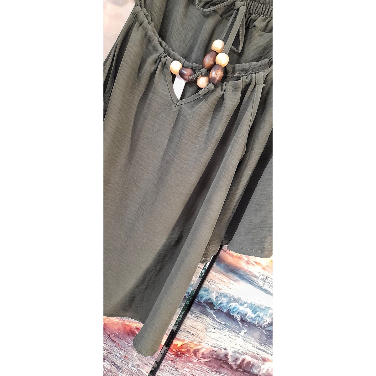 Completo a fantasia per il mare | Grace Completo estivo composto da pantaloncino in cotone leggero con coulisse ed elastico invita, top corto con spalline regolabili e kimono con cintura in vita tono su tono. Taglia unica
