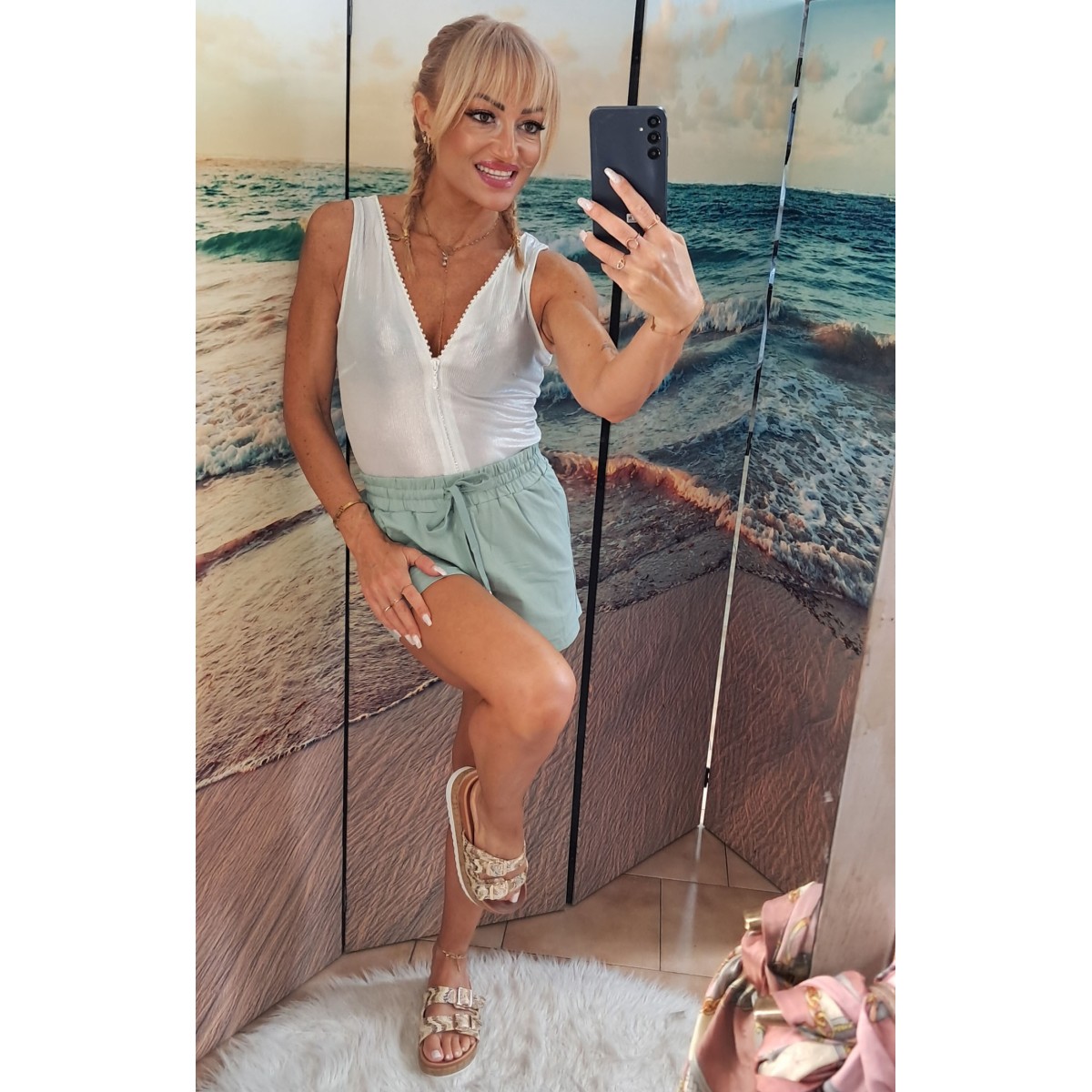 Bermuda misto lino | Alena Bermuda misto lino tinta unita, materiale fresco e leggero, lunghezza alla coscia, elastico in vita e due tasche laterali. Taglia unica. SaraMode.it consiglia: perfetto abbinato alla canotta dello stesso colore e tessuto (vedi Accessori) ed un paio di sandali con zeppa per un look molto chic ed elegante.