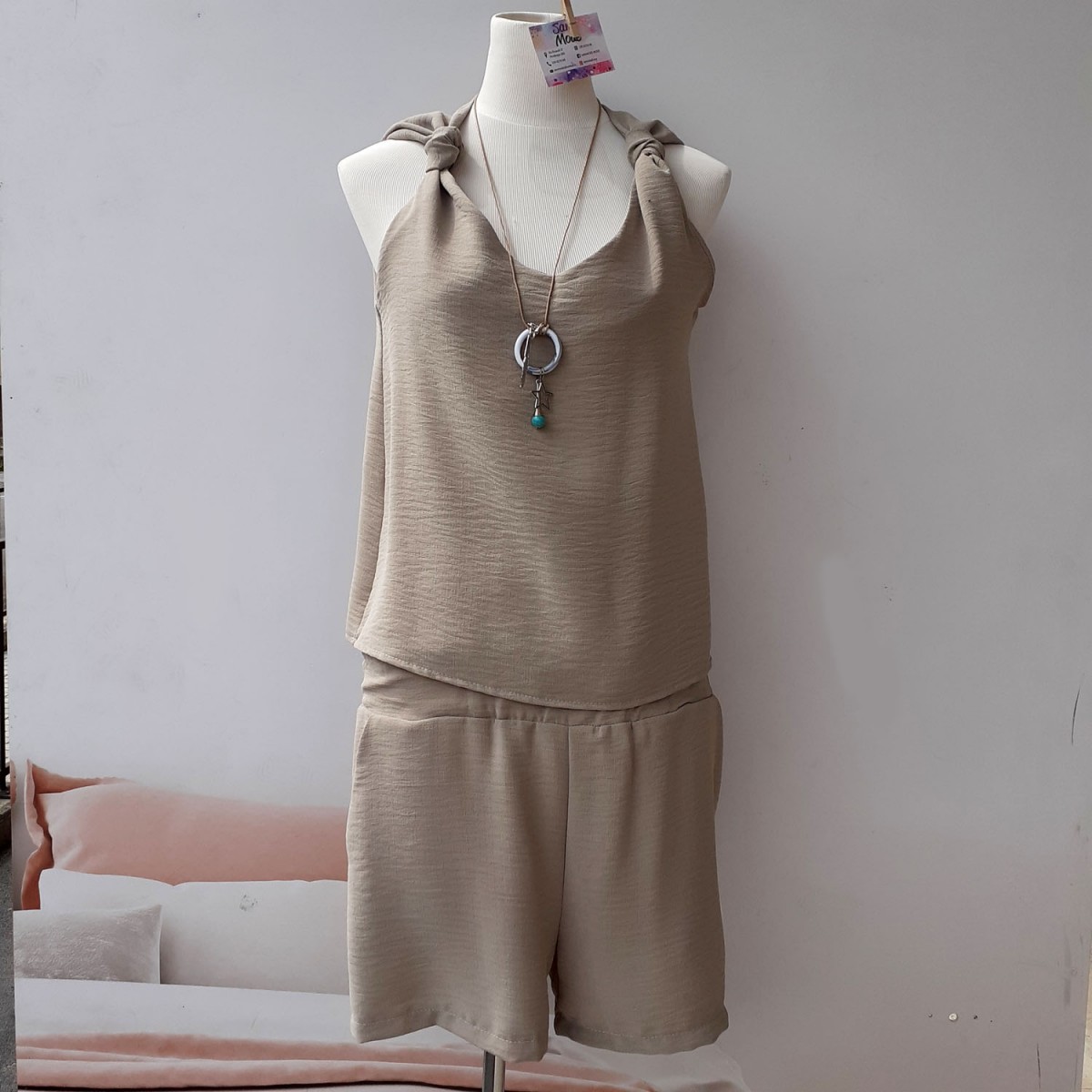 Tutina corta in tessuto morbido con shorts corti, vestibilità morbida, scollo ampio, maniche a tre quarti, due tasche laterali, elastico in vita con coulisse. Taglia unica