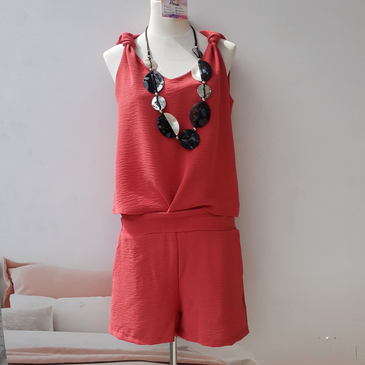 Tutina intera corta | Patty Tutina corta in tessuto morbido con shorts corti, vestibilità morbida, scollo ampio, maniche a tre quarti, due tasche laterali, elastico in vita con coulisse. Taglia unica