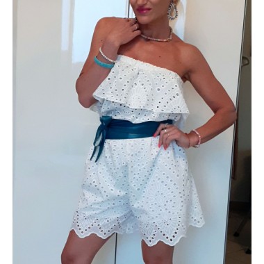 Tutina corta bianca in pizzo sangallo, lunghezza pantaloncini alla coscia, corpetto con volant per mettere in evidenza il decolleté, vestibilità slim (accessori non inclusi nel prezzo). Taglia unica.
