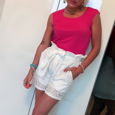 Shorts bianchi in pizzo sangallo con due tasche laterali, elastico in vita con arricciatura alta e cintura tono su tono, vestibilità morbida, lunghezza alla coscia. Taglia unica.