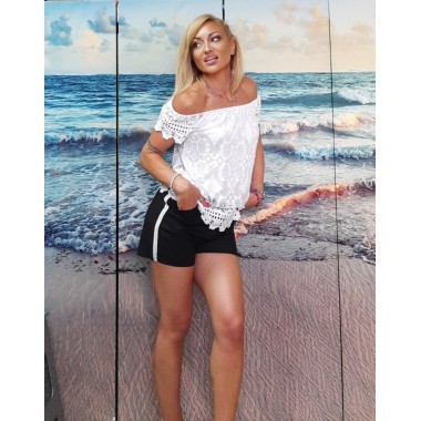 Shorts di cotone neri con banda laterale argento, vestibilità aderente perfetti per il mare, elastico in vita e due tasche laterali.
