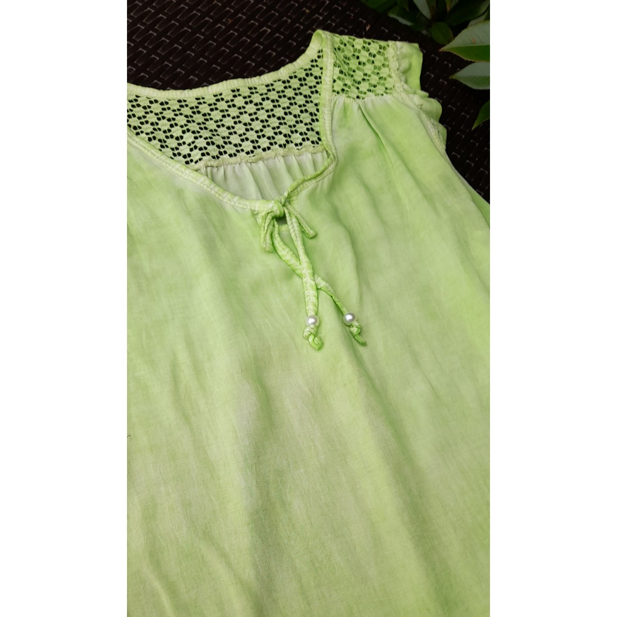 Blusa smanicata con volant in tessuto leggero, scollo a V profondo con nastrino tono su tono, vestibilità morbida. Taglia unica