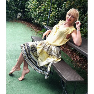 Blusa in viscosa lucida con scollo tondo spalla scoperta, maniche a tre quarti, vestibilità morbida. Taglia unica.