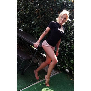 Completo due pezzi con top corto a manche corte, scollo tondo e lacci laterali per arricciare e accorciare la vestibilità, pantalone aderente a zampa, vestibilità aderente. Taglia unica