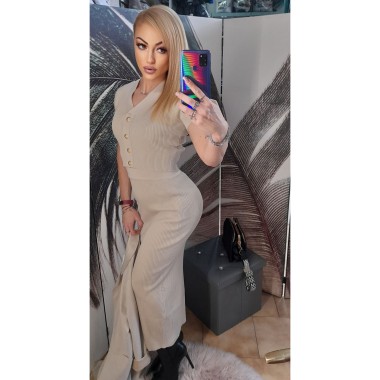Completo elegante composta da gonna lunga aderente con bottoni dorati per tutta la lunghezza, top corto aderente scollo a V con bottoni dorati e mezze maniche. Taglia unica