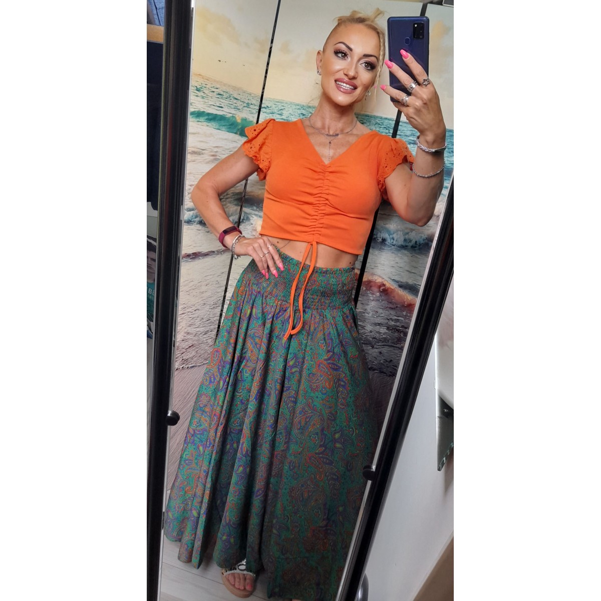 Completo colorato in tessuto lucido | Charlie Completo tinta unita in tessuto lucido simile al raso: casacca smanicata con collo alto con nastro, gonna lunga con elastico in vita arricciato. Vestibilità morbida. Taglia unica
