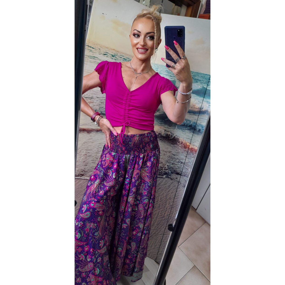 Completo top corto con maniche arricciate e spalle scoperte, gonna lunga con elastico in vita. Vestibilità gonna morbida, vestibilità top slim. Taglia unica