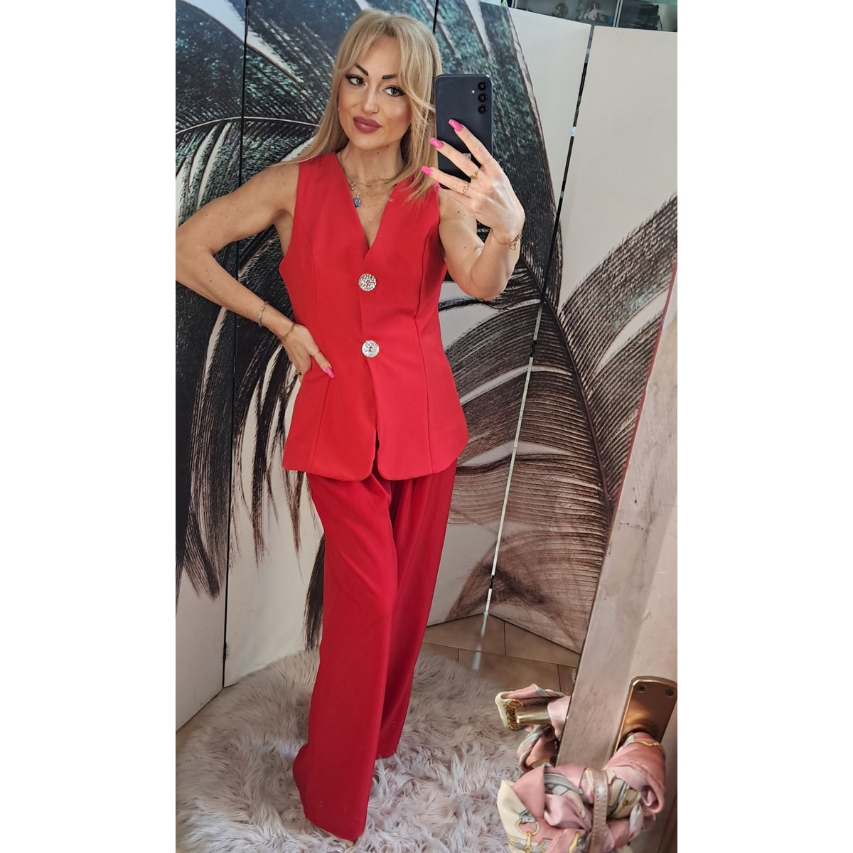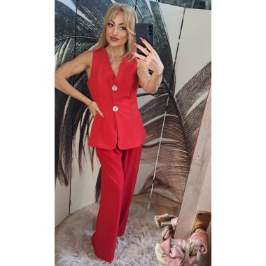 Completo elegante da cerimonia composto da: gilet lungo con bottoni dorati, vestibilità sciancrata, foderato e pantalone lungo con elastico in vita e bottone dorato, vestibilità morbida. Taglia unica