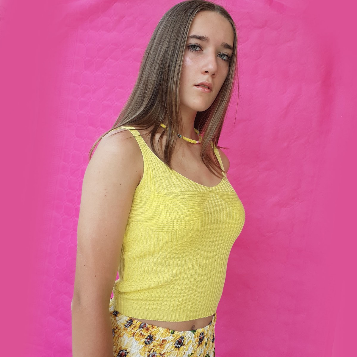 Top corto tinta unita in cotone elasticizzato a costine, scollo tondo profondo, spalline sottili, vestibilità aderente. Taglia unica.