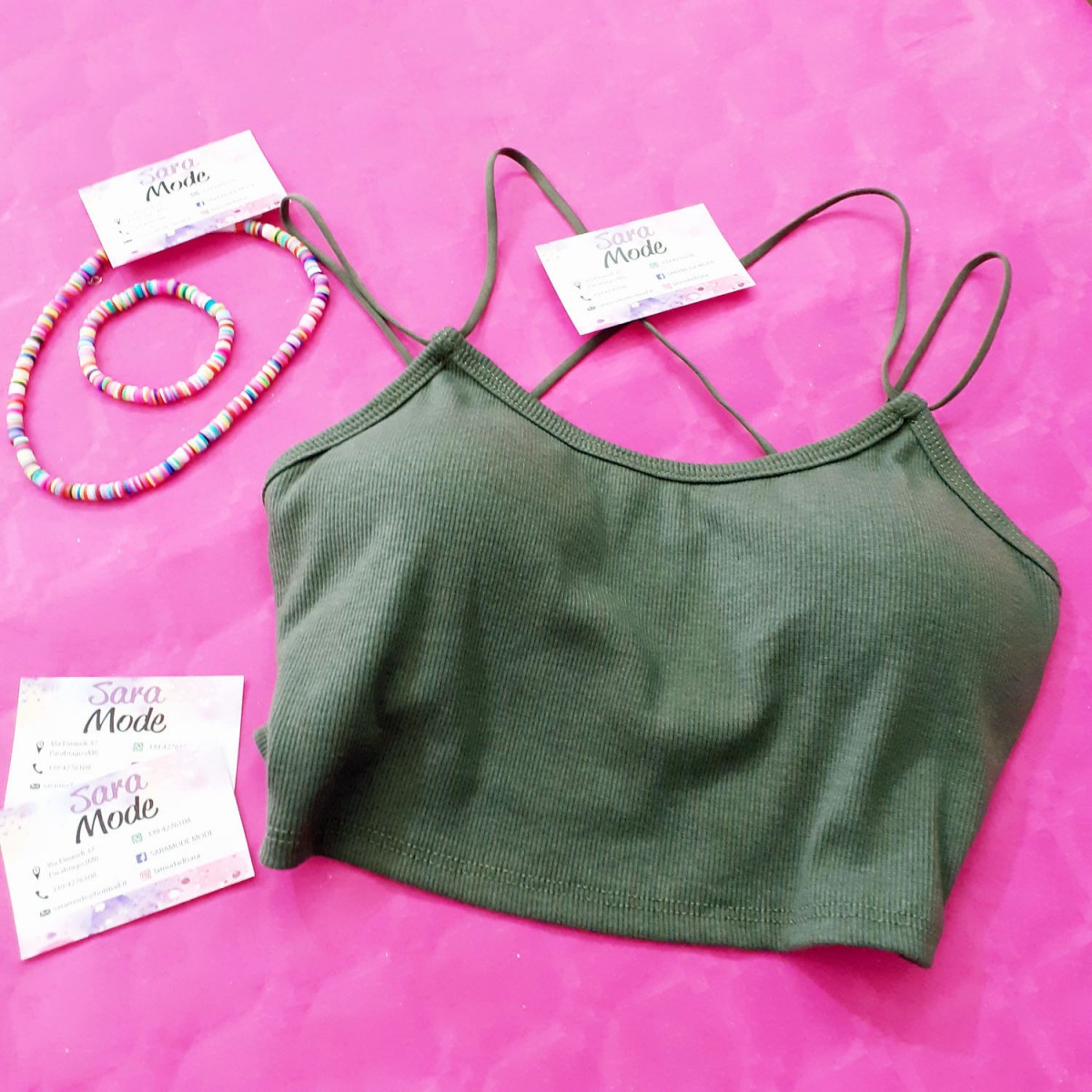 Top corto tinta unita in cotone elasticizzato a costine, scollo tondo profondo, spalline sottili, vestibilità aderente. Taglia unica.