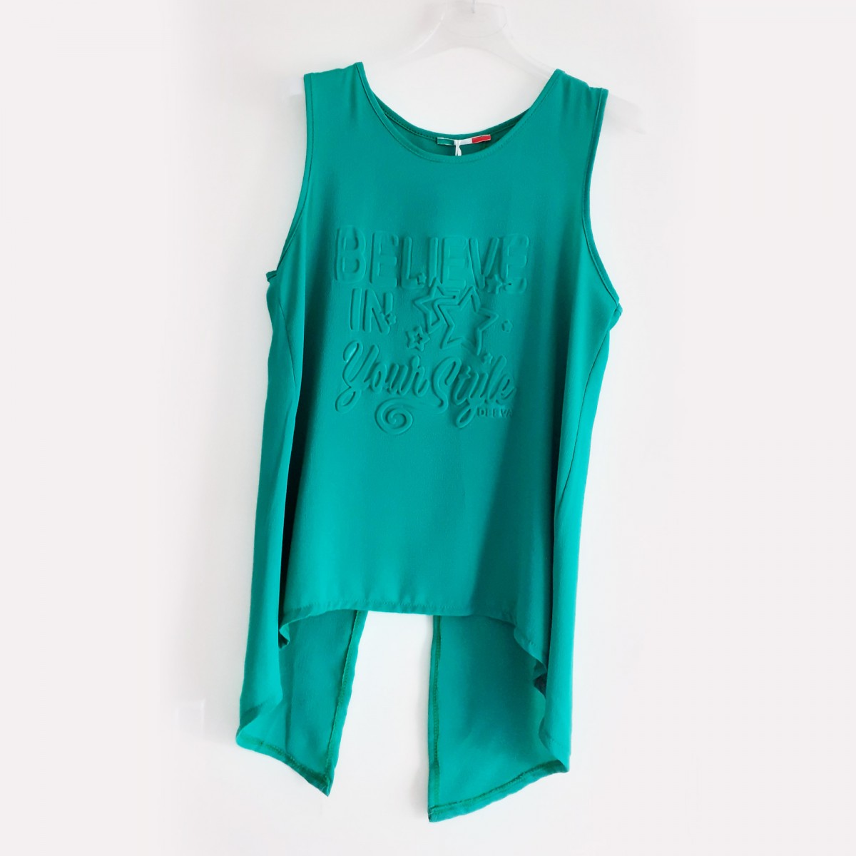 Canotta lunga, spalla larga, scollo tondo, scritta davanti in rilievo "Believe in your style", color verde menta, spacco profondo sulla schiena, tessuto leggero, vestibilità morbida e sciancrata.