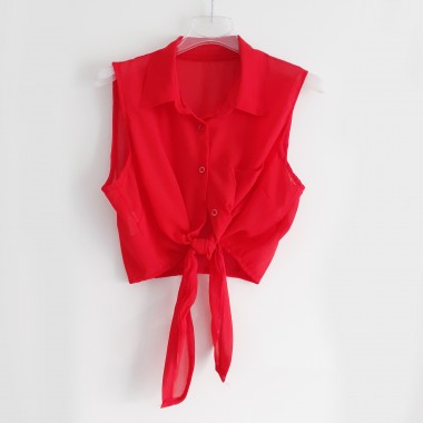Top/Camicetta corta con nodo, tinta unita, chiusura con bottoncini e scollo a V profondo, maniche a giro, tessuto trasparente vedo/non vedo con lunghezza regolabile grazie al nodo. Ideale da indossare come top o come sottogiacca.