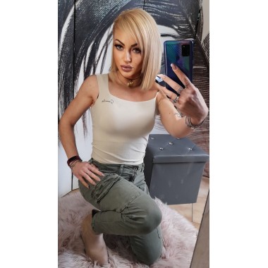Tuta completa modello trendy composta da pantalone a palazzo vestibilità morbida e topo corto a canotta vestibilità aderente. Taglia unica