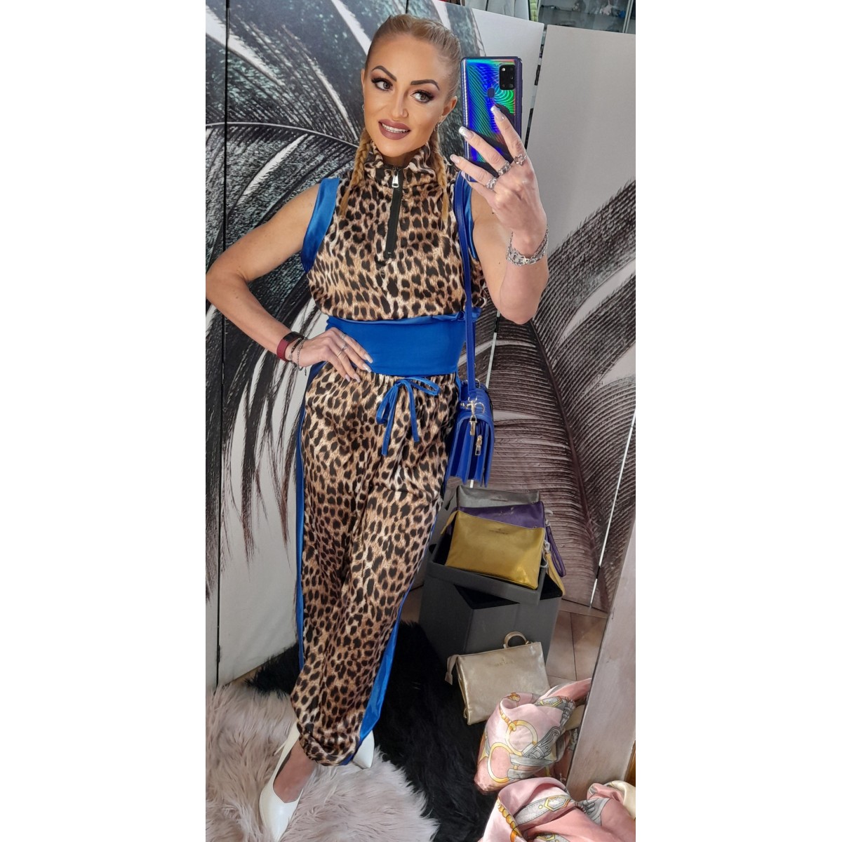 Completo maculato in tessuto leggero con top corto con elastico, maniche a giro, scollo alla coreana con cerniera, pantalone modello sporty con elastico in vita e alla caviglia. Taglia unica