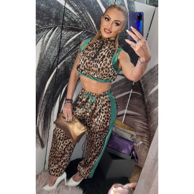 Completo maculato in viscosa con top corto con elastico, maniche a giro, scollo alla coreana con cerniera, pantalone modello sporty con elastico in vita e alla caviglia. Taglia unica