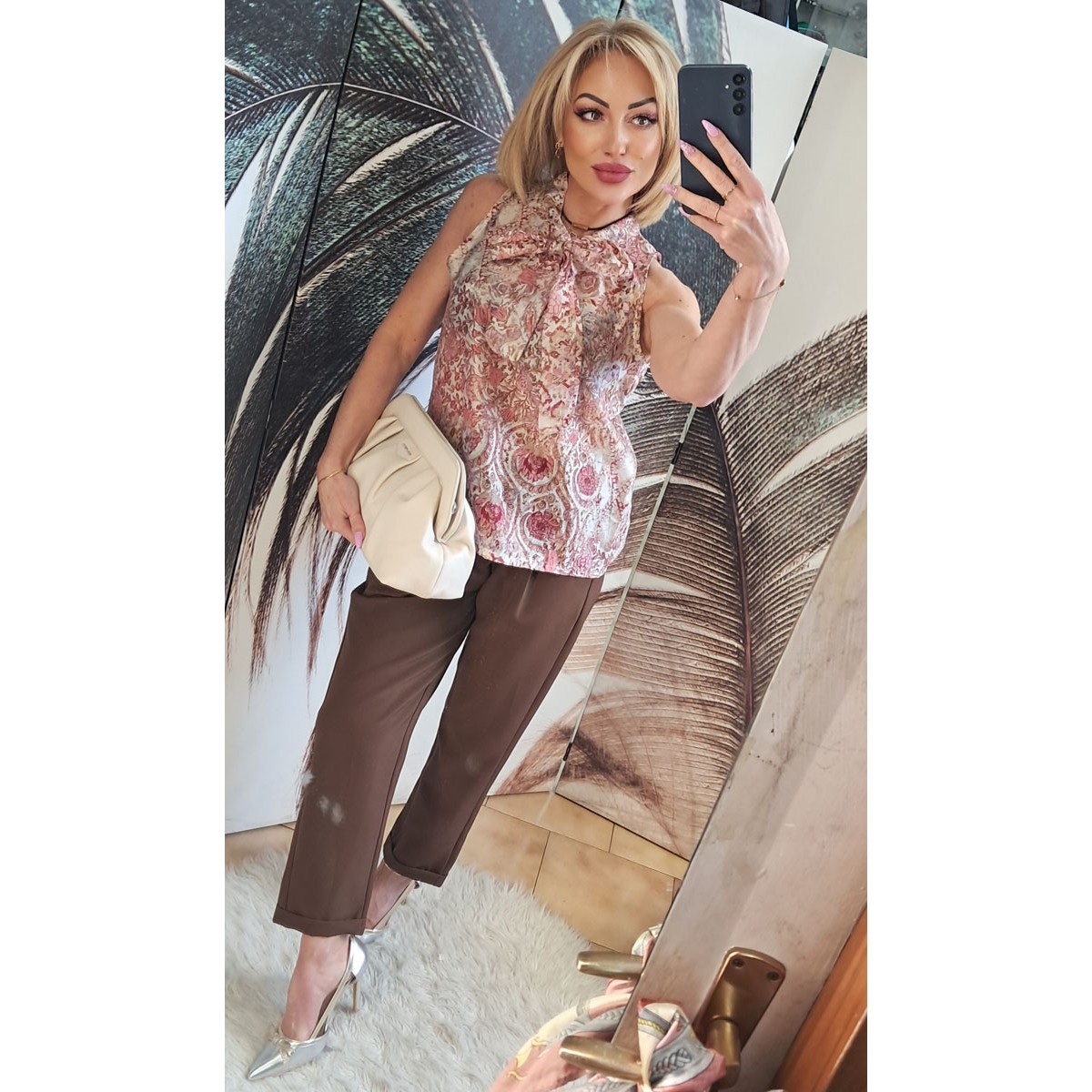 Completo top e pantaloni a fantasia | Silvana Completo fantasia gonna e top a triangolo con spalline regolabili e nodo sulla schiena, fantasia floreale e geometrica, tessuto lucido, vestibilità morbida. Taglia unica