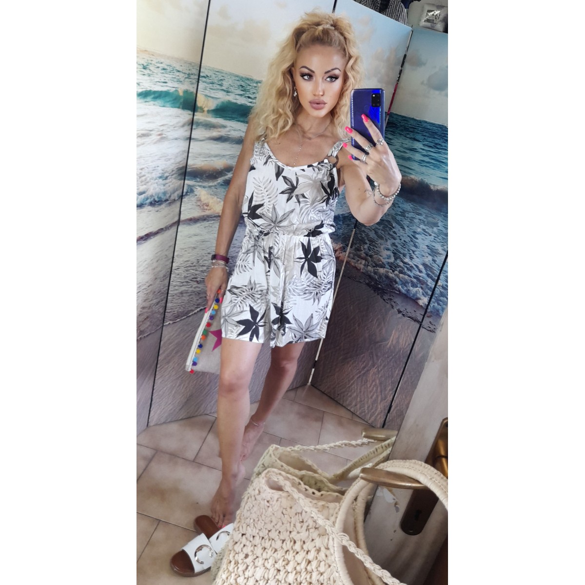 Tutina corta | Patty Tutina corta con spalline sottili, ampia scollatura con dettagli colorati, lunghezza alla coscia, vestibilità morbida. Taglia unica