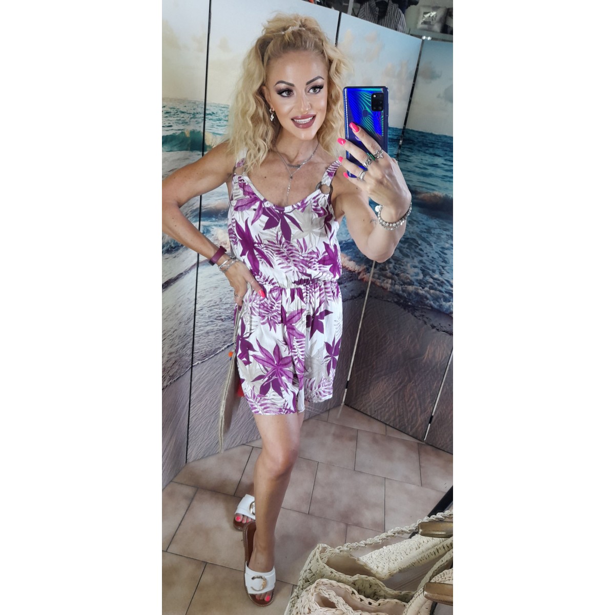 Tutina stampa floreale su sfondo bianco, allacciatura dietro il collo che mette in risalto spalle e schiena, scollo V profondo, elastico in vita con arricciatura, lunghezza pantalone a 3/4, vestibilità molto morbida. Taglia unica.