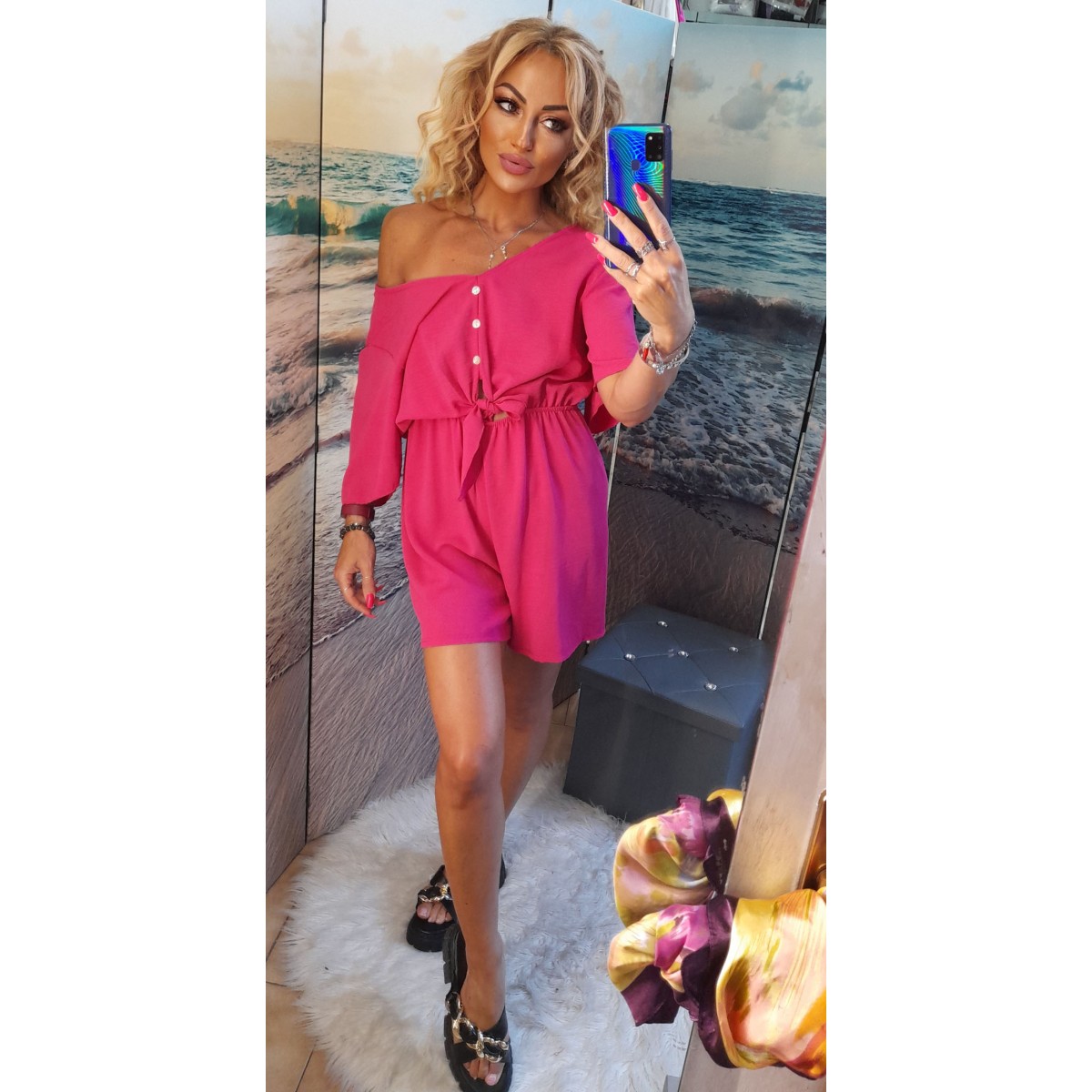 Tutina corta in viscosa con ampia scollatura a V con bottoncini, elastico in vita con cinturina tono su tono, vestibilità morbida. Taglia unica