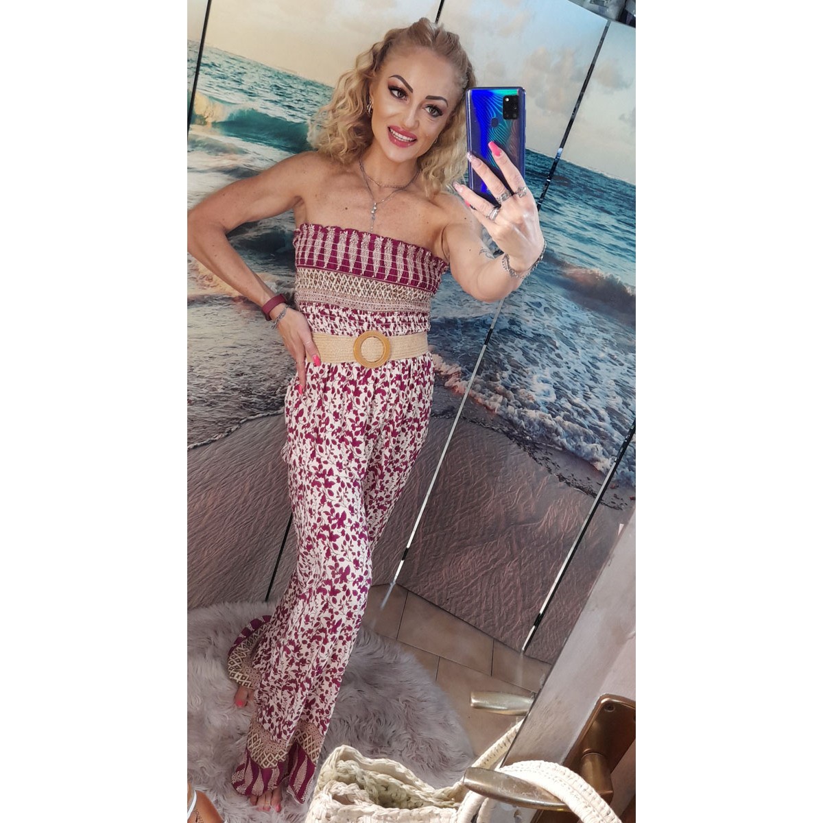 Tutina intera di cotone leggero a fantasia geometrica, spalle scoperte con corpetto elastico arricciato, cintura beige elasticizzata in dotazione, vestibilità slim. Taglia unica