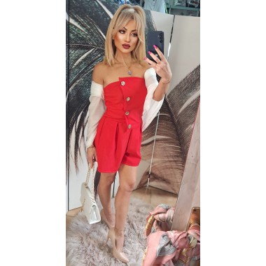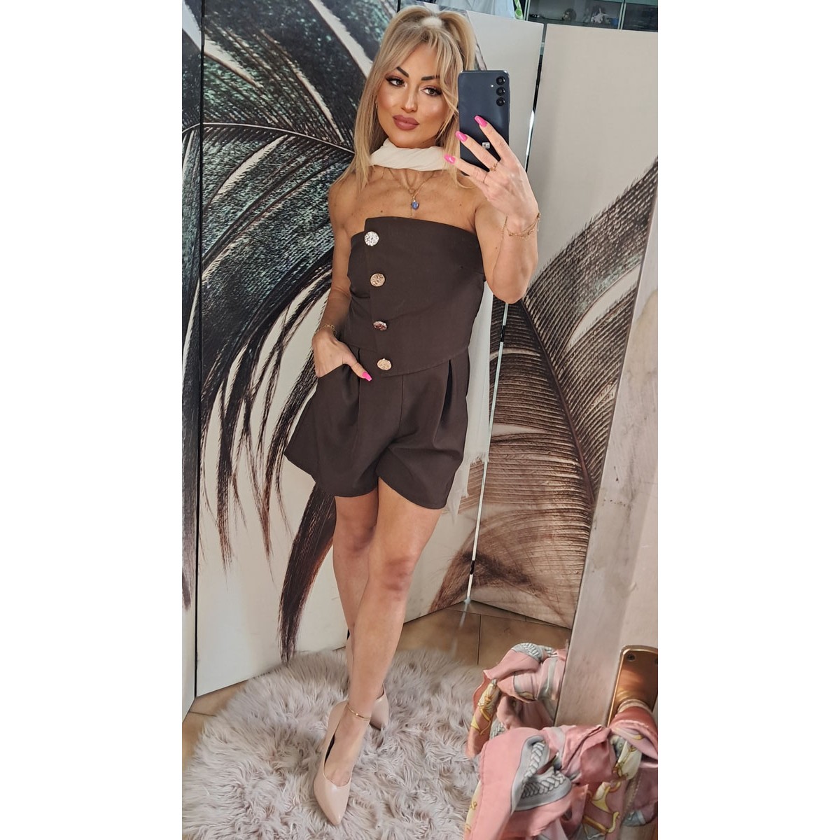 Tutina corta elegante con spalle scoperte in tessuto elasticizzato con elastico sul retro e in vita per modellare le forme, dettagli dorati sul fronte. Taglia unica