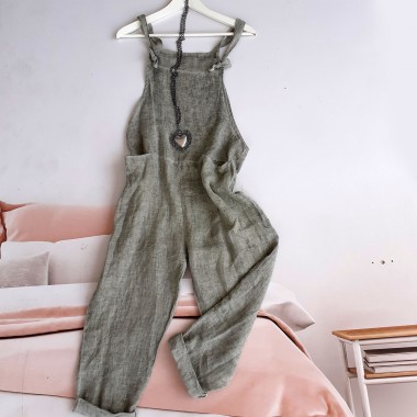 Salopette misto lino fresca e leggera, con tasconi laterali. Vestibilità morbida e comoda. Taglia unica.