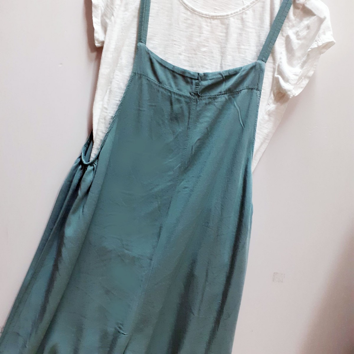 Salopette corta tinta unita con doppia spallina sottile, tessuto fresco e leggero, vestibilità morbida, lunghezza sopra il ginocchio. Taglia unica.