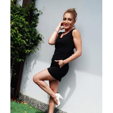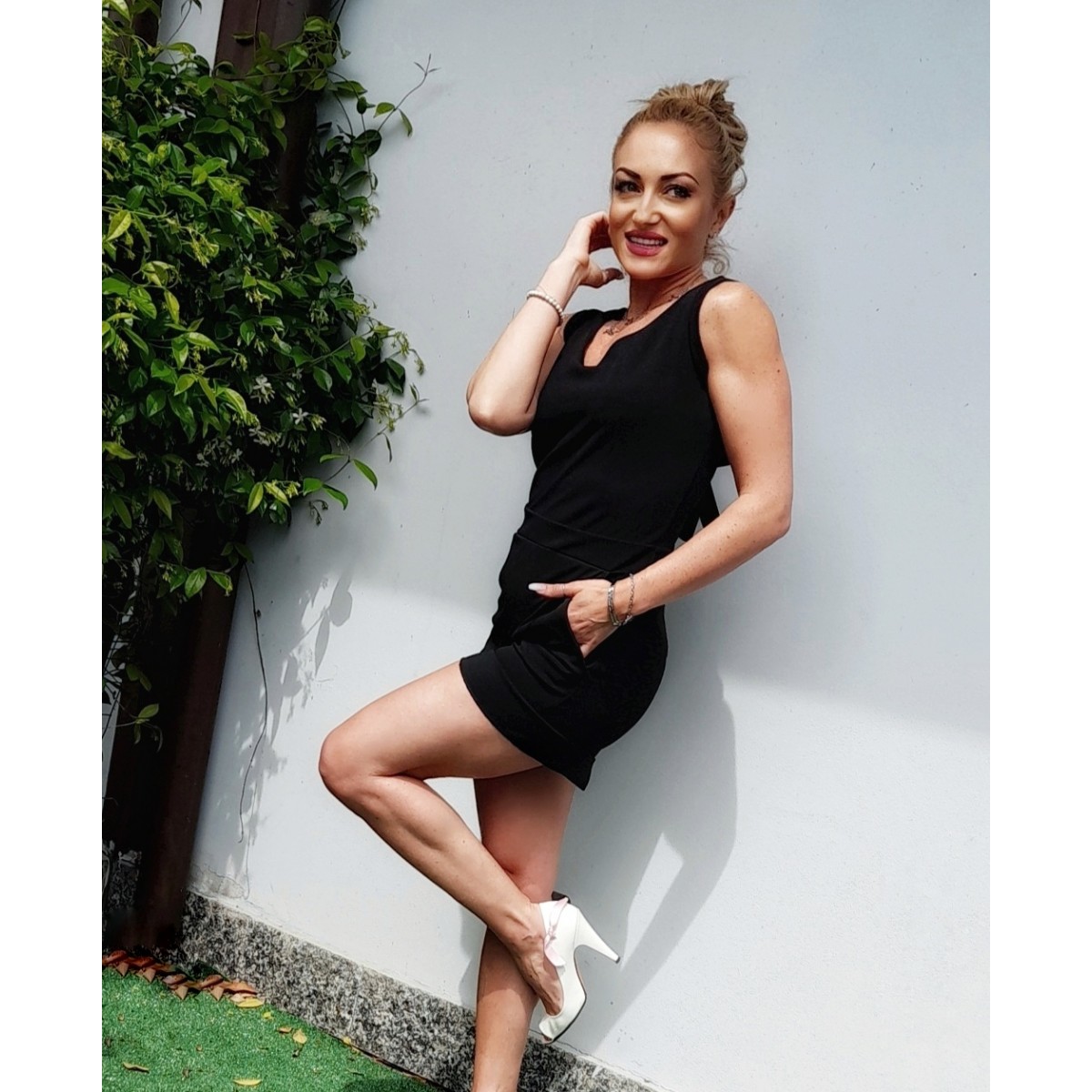 Tutina corta smanicata total black, scollo a V profondo anche sulla schiena con fiocco in tessuto, due tasche laterali, vestibilità slim. Taglia unica