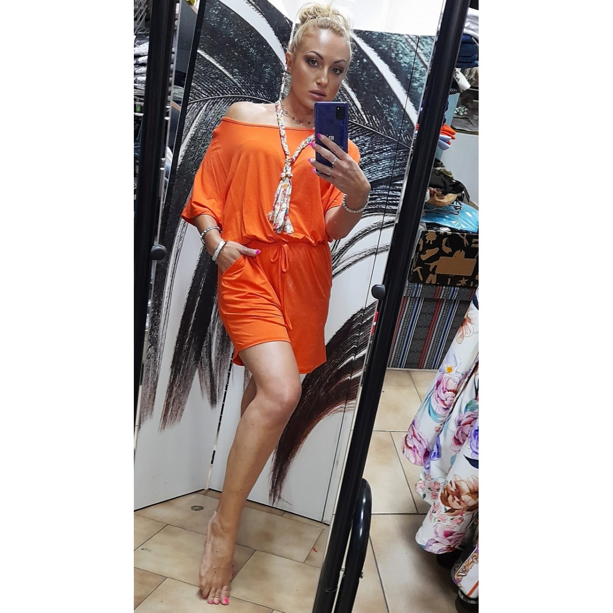 Tutina corta in tessuto morbido con shorts corti, vestibilità morbida, scollo ampio, maniche a tre quarti, due tasche laterali, elastico in vita con coulisse. Taglia unica