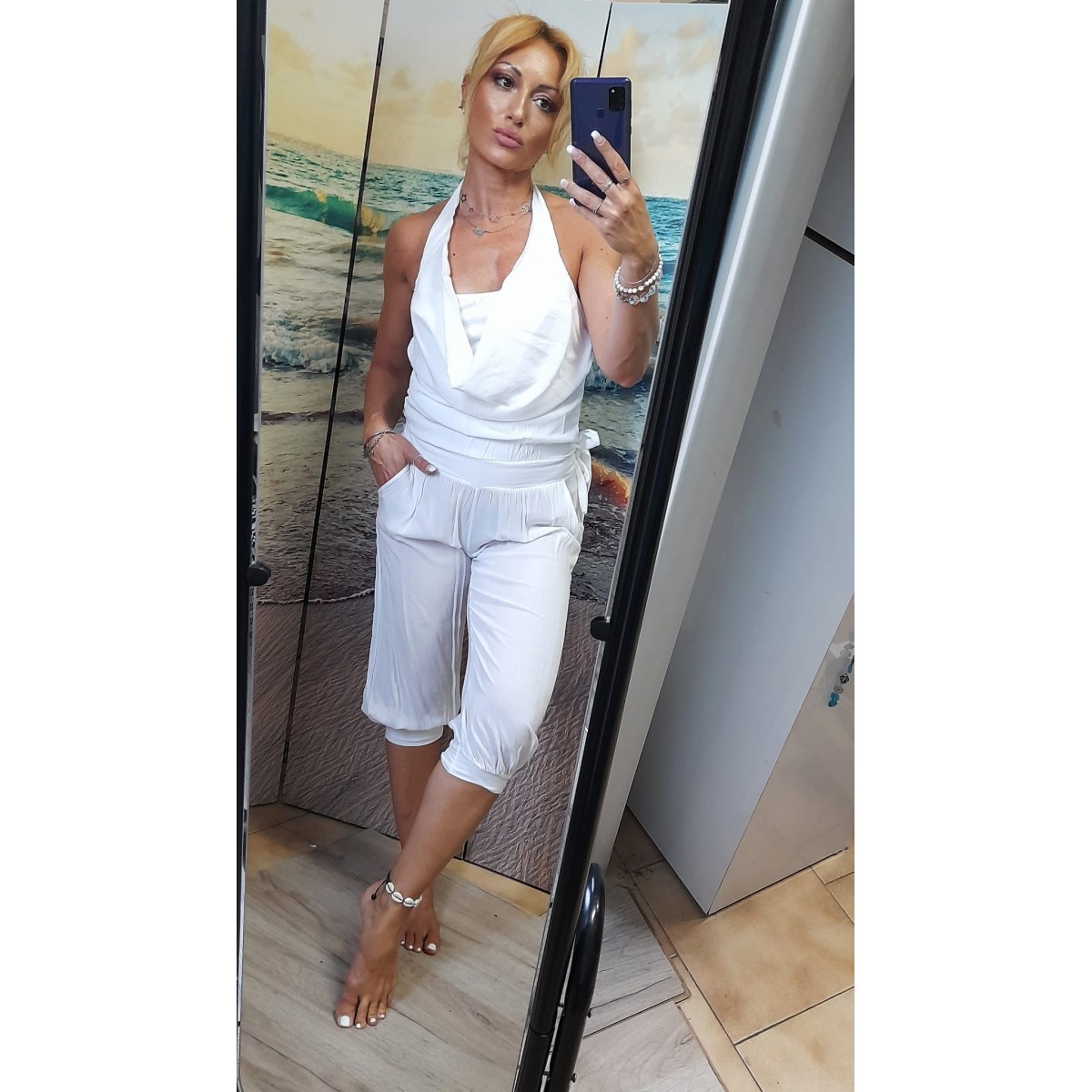 Tutina di cotone leggero con spalle scoperte, elastico in vita e alle caviglie, due tasche laterali, vestibilità slim, modello ricercato e versatile. Taglia unica.