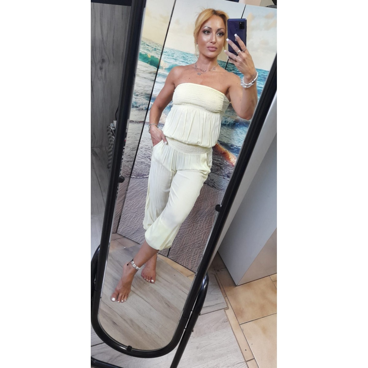 Tutina di cotone leggero con spalle scoperte, elastico in vita e alle caviglie, due tasche laterali, vestibilità slim, modello ricercato e versatile. Taglia unica.